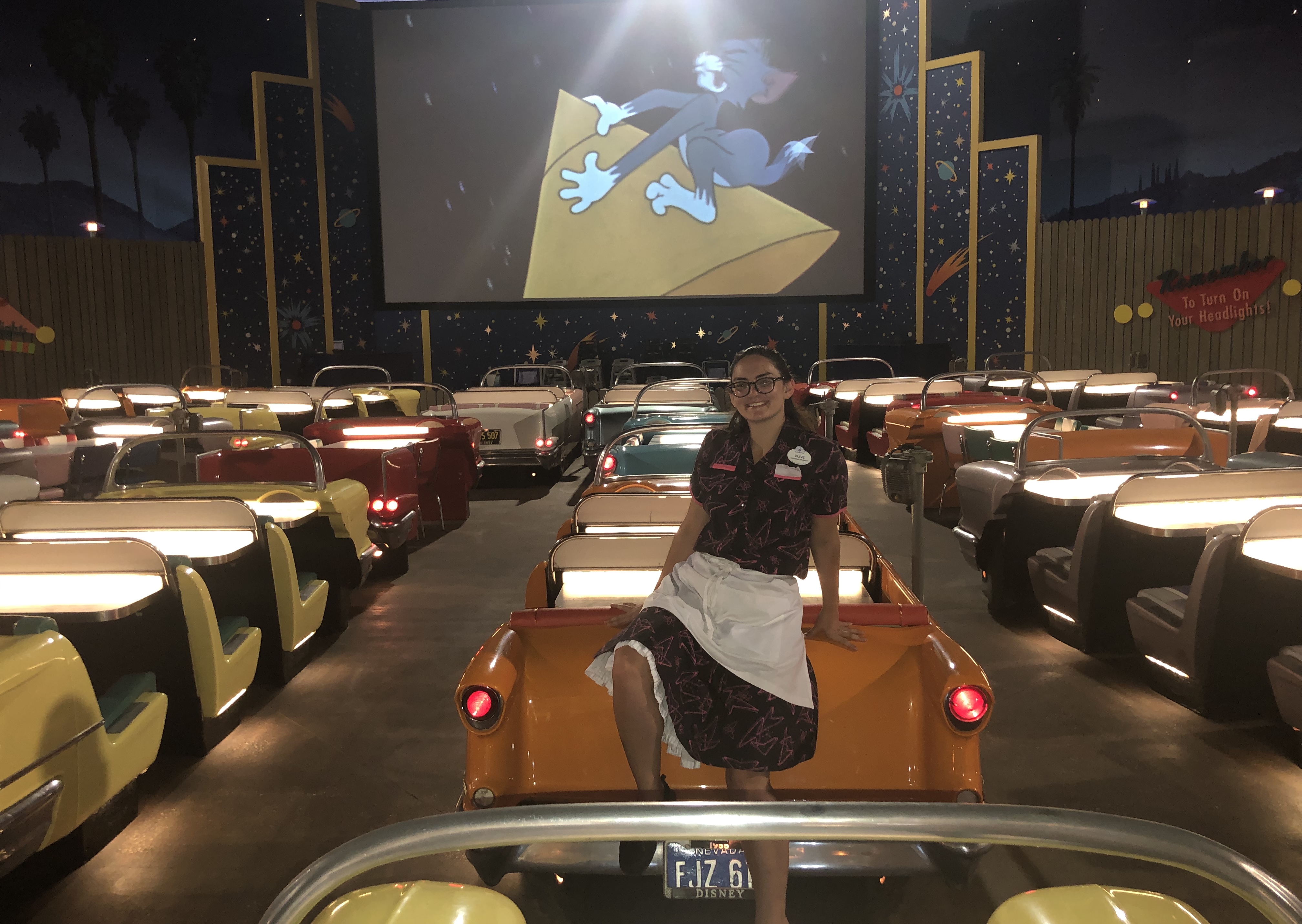 Olivia Bauer, wearing a costume and apron and sitting on the hood of a prop car, surrounded by diner booths with a screen showing a Tom and Jerry episode in the background