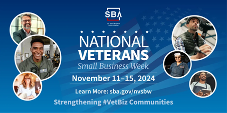 The Small Business Administration (SBA) recognizes the annual National Veterans Small Business Week (NVSBW) as a time to celebrate and empower service members, veterans, National Guard and Reserve members, and military spouse entrepreneurs. During this week resources, training, and tools are provided for your business startup.