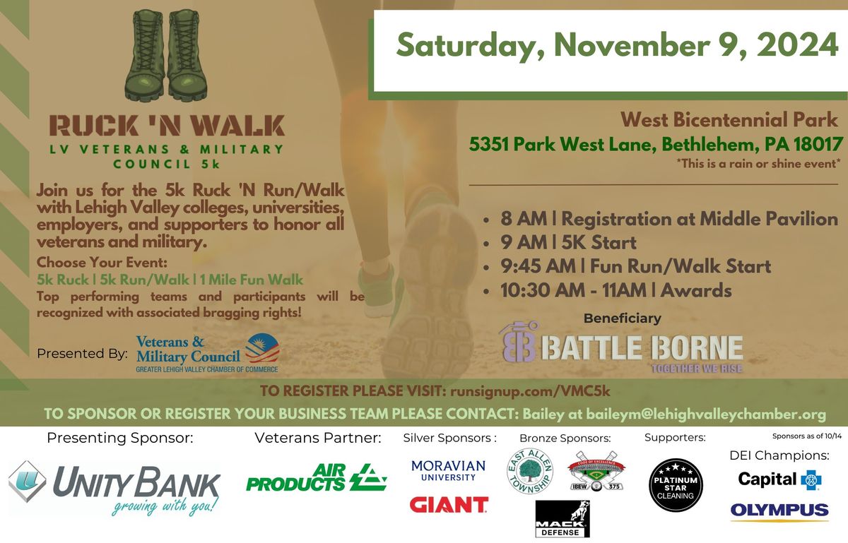Join Lehigh Valley colleges, universities, businesses and community members as they Ruck OR Run/Walk to recognize and honor all veterans throughout the Lehigh Valley.