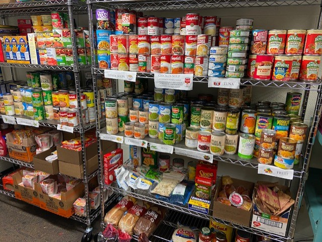 The pantry is stocked with a variety of non-perishable foods and products, including canned fruits and vegetables, peanut butter, jelly, snack bars, crackers, rice, sauce, pastas, etc. Personal care items and school supplies are also available. No appointments are necessary.