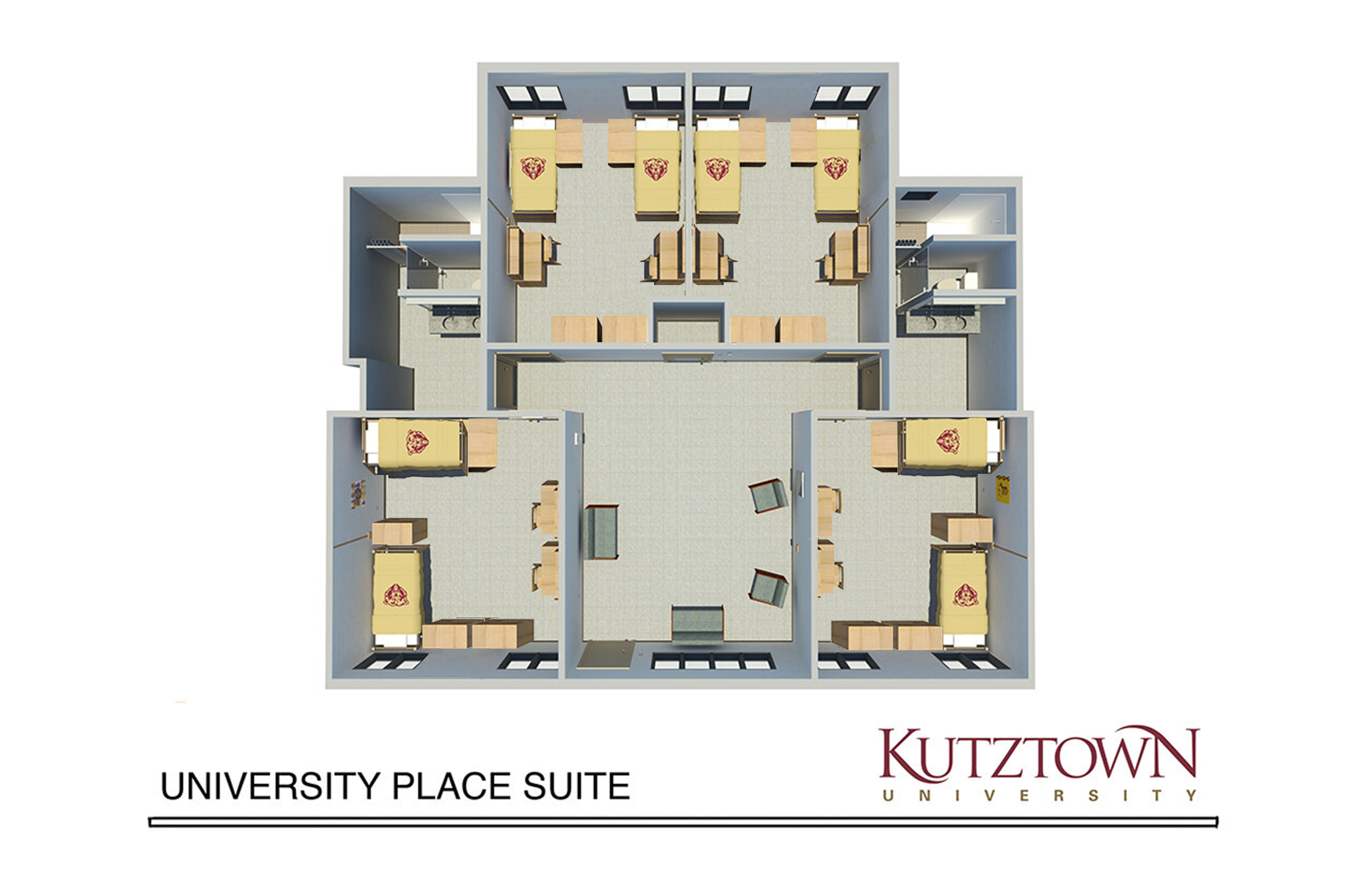 University Place is an air-conditioned, suite-style residence hall. There are four bedrooms, two bathrooms, and a shared living room area in each suite. The bedrooms are double occupancy. The University Place Annex, a separate building located in the courtyard of University Place, contains bedrooms and has a kitchen and common area located on the first floor.