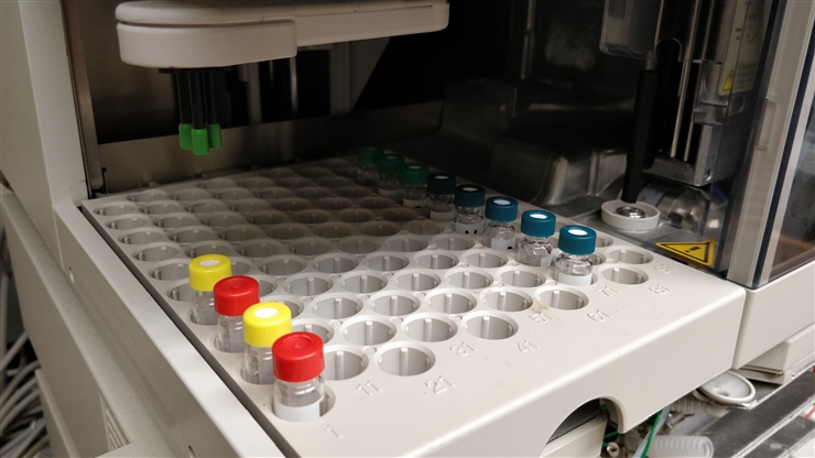 This instrument has an automated liquid chromatographic (LC) front end, and a powerful tandem mass spectral detector capable of discriminating molecules according to mass and electrical charge (its mass to charge ratio), and the way molecules dissociate when they collide with inert gas atoms. This detection strategy allows one to single out individual molecules from complex samples, and determine concentrations of molecules at extremely low levels (sometimes sub-part per billion concentrations). This instrument is described more fully on the LC-MS/MS page.