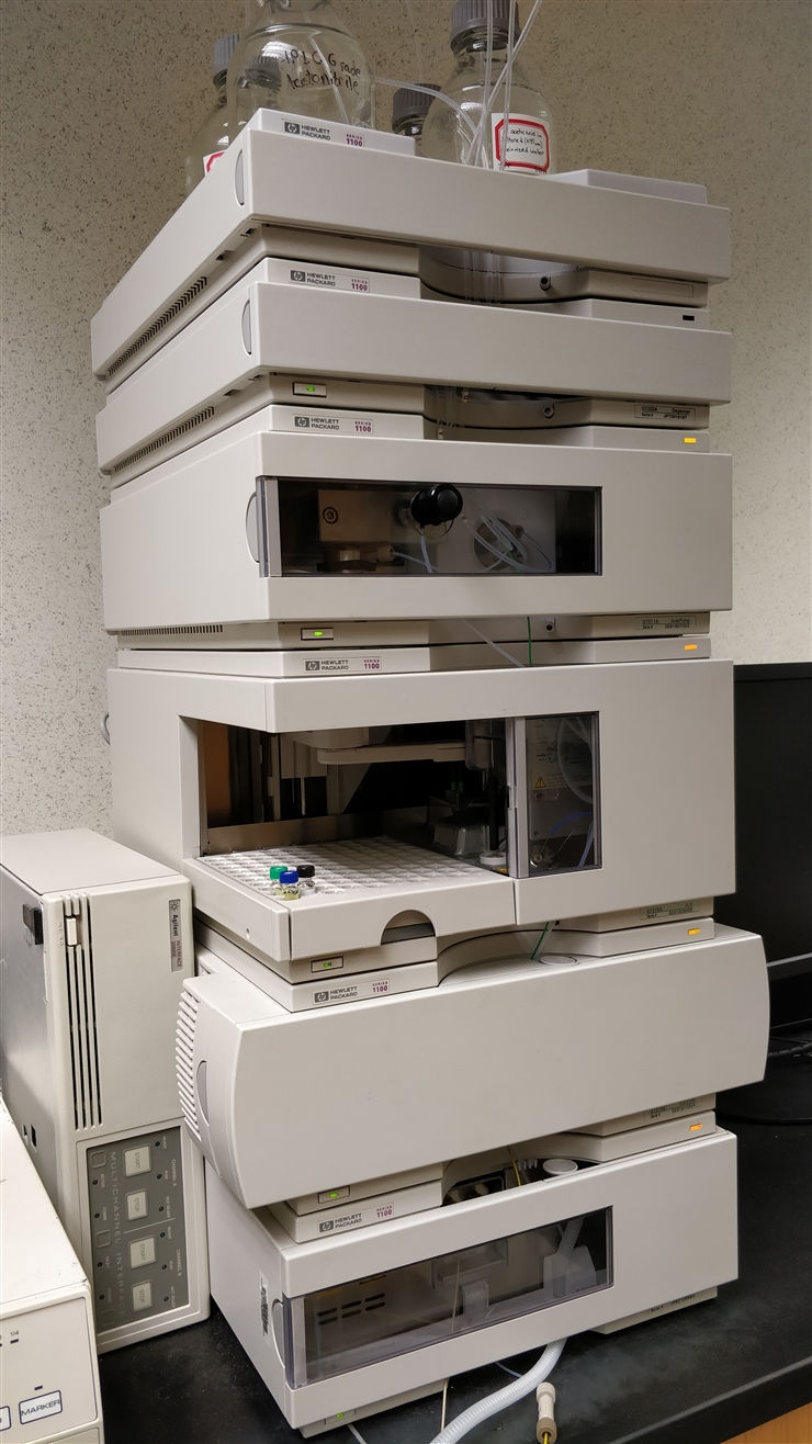 Our two Agilent 1100 HPLC systems are fully automated systems operating under the most recent version of Agilent's OpenLAB ChemStation software. The quaternary pumps are capable of mixing four different solvents to produce the mobile phase. The autosamplers are capable of automating the injection of up to 100 samples. One system is equipped with a multiwavelength detector capable of monitoring 5 wavelengths at a time, and the other has both a variable wavelength detector and a refractive index detector which can detect components that don't absorb light in the UV or visible regions (like sugars).