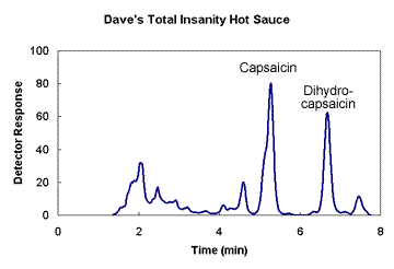 Chromatogram of Dave's Total Insanity Sauce extract showing peaks for Capsaicin and Dihydrocapsaicin