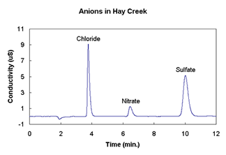 The Dionex Ion Chromatograph (IC) is designed to separate ions rather than neutral molecules. As in HPLC, the separation also involves both mobile and stationary phases, but the stationary phase has electrically charged groups to attract ions to various degrees. The detector in this system monitors the conductivity of the mobile phase. When an ion exits the column, the conductivity changes. This system is fully automated and includes an autosampler. The autosamplers allow us to perform repetitive injections overnight and retrieve data for analysis without wasting precious class time.