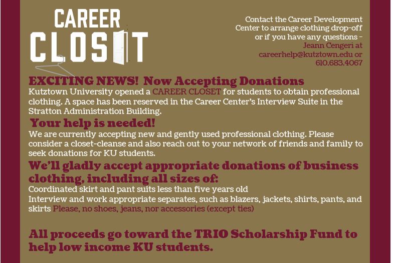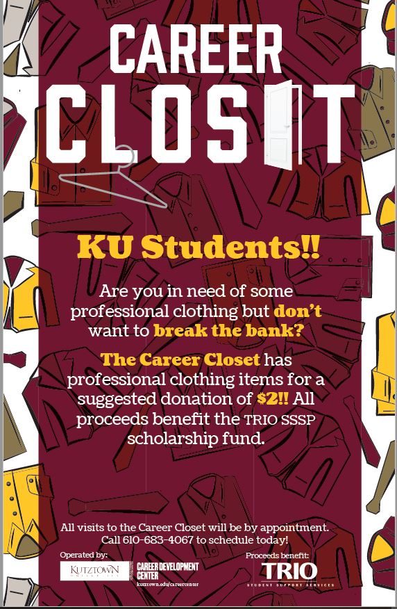 If you are a KU student in need of professional clothing, the KU Career Closet can assist you with our selection of donated professional wear. Schedule an appointment in Handshake or call our office: 610-683-4067 to set up an appointment to visit. Due to inventory, we limit to 3 items per year.