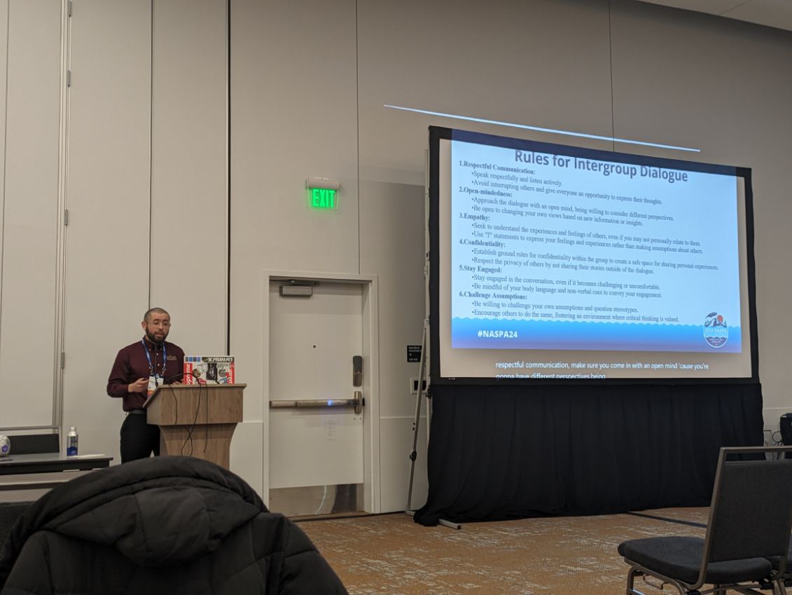 Graduate student Giovanni Negron-Garcia presenting his research, Intergroup Dialogue and Advancing DEI in Higher Education (and Beyond), at the conference in Seattle. Attendees learned how to contribute to group dialogue in ways that will positively impact their community of higher learning (and beyond).
