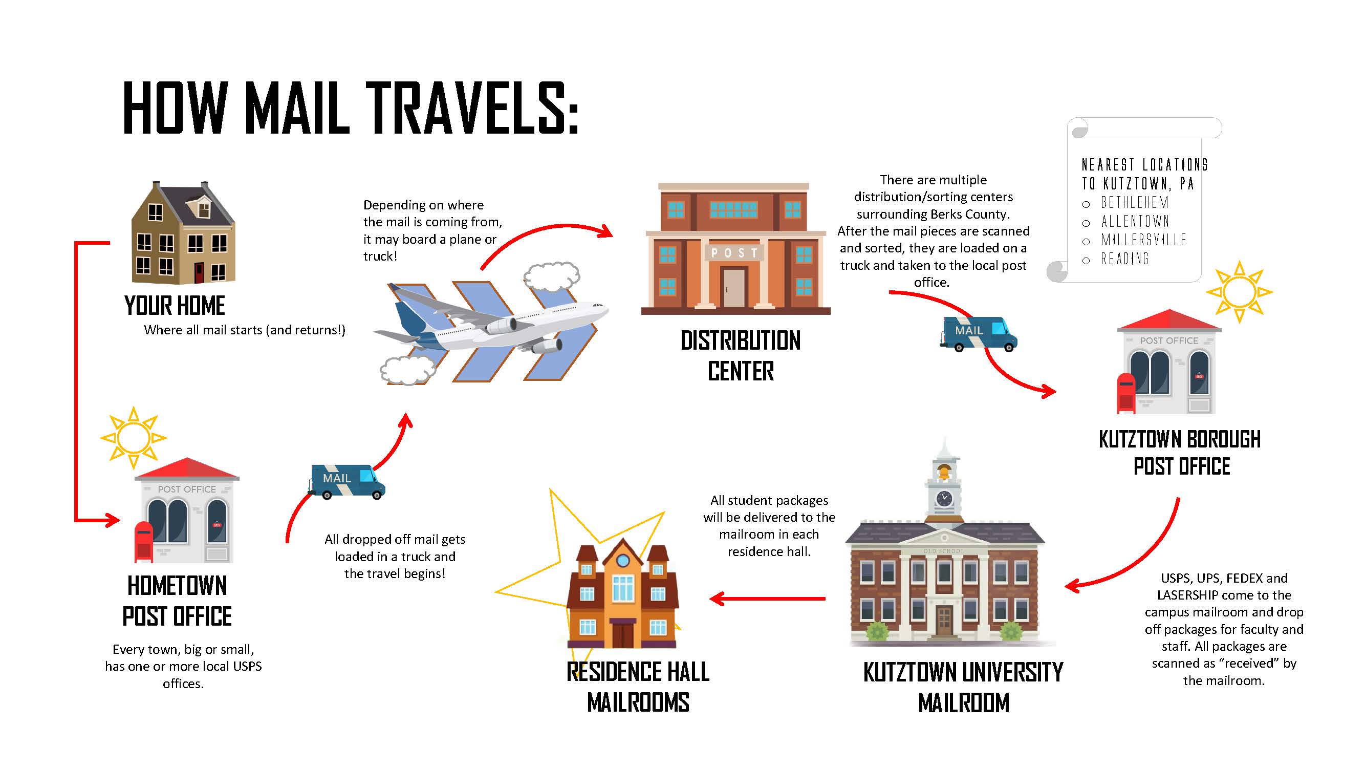 It is important to understand that once mail is shipped from the sender, there are many steps that occur before mail arrives on campus to be delivered to the recipient. This diagram shows you how mail/packages are processed and why a package may be shown to you as "delivered" but is not yet in your possession.