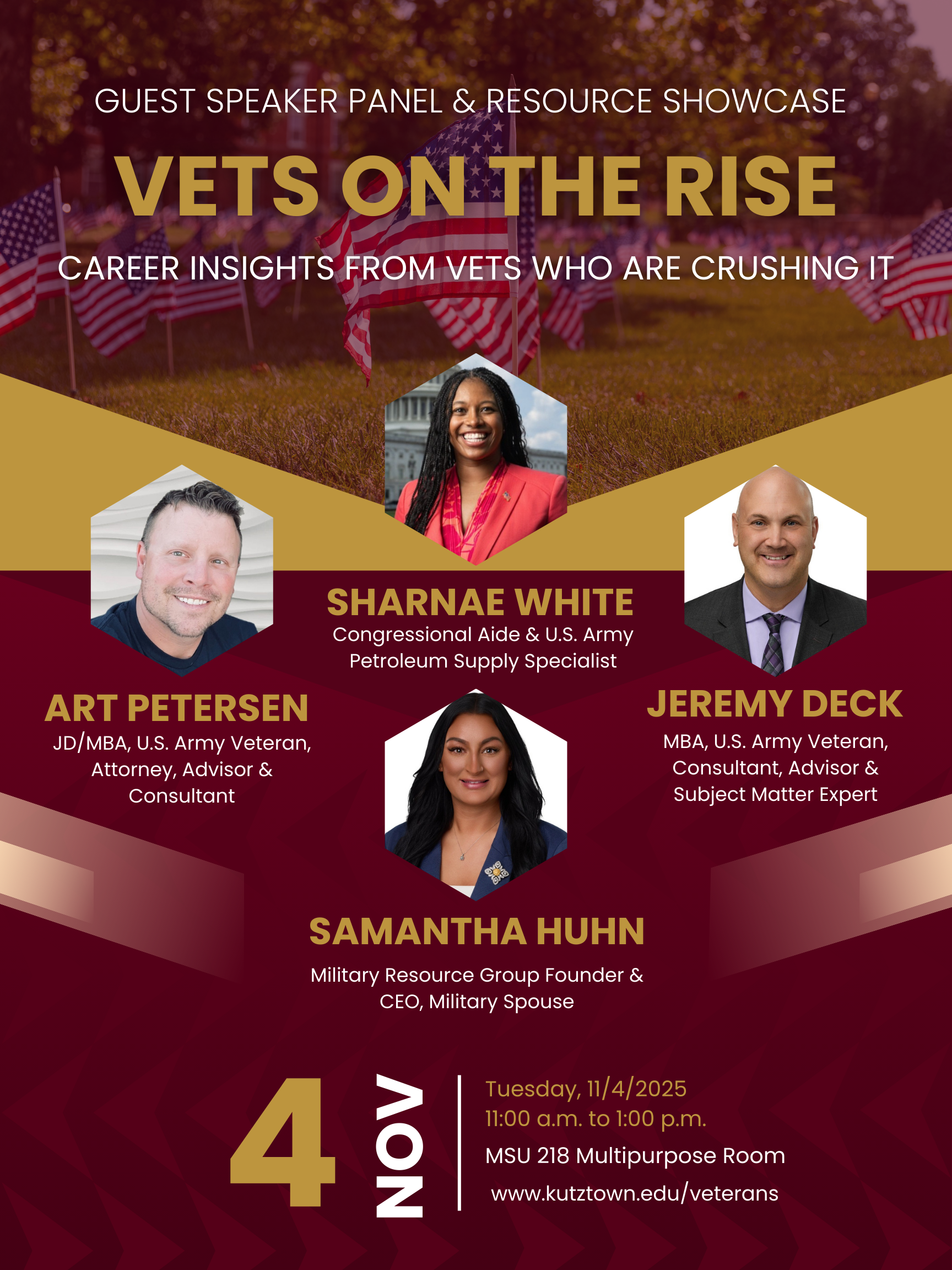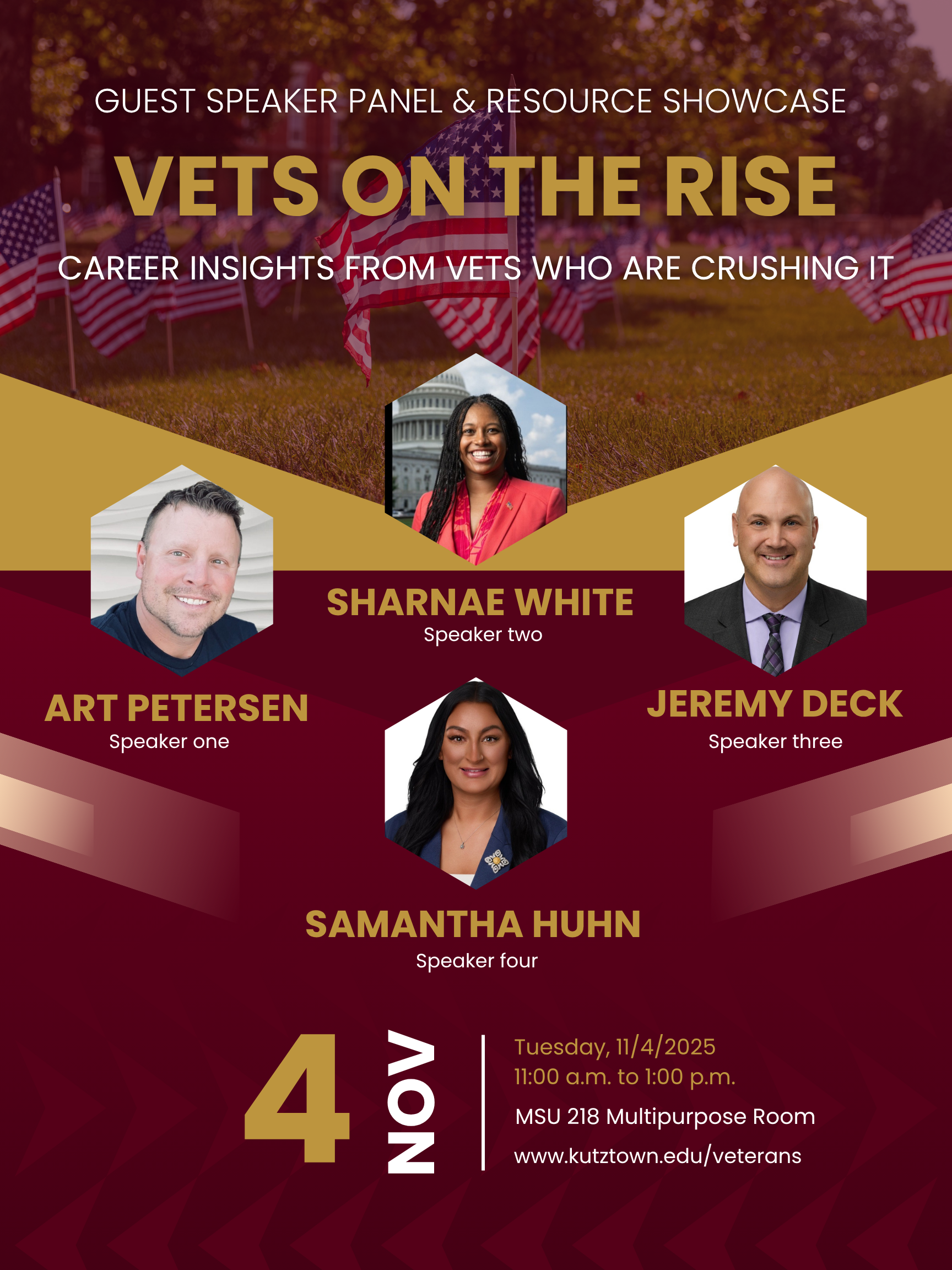 The best time of year is here! In 2008 Congress approved a resolution designating "National Veterans Awareness Week" to emphasize the need to develop educational programs regarding the contributions of veterans to the country (S.Res.692). Kutztown University recognizes and honors our military and veteran community and their families. Join us as we celebrate with a week of activities.