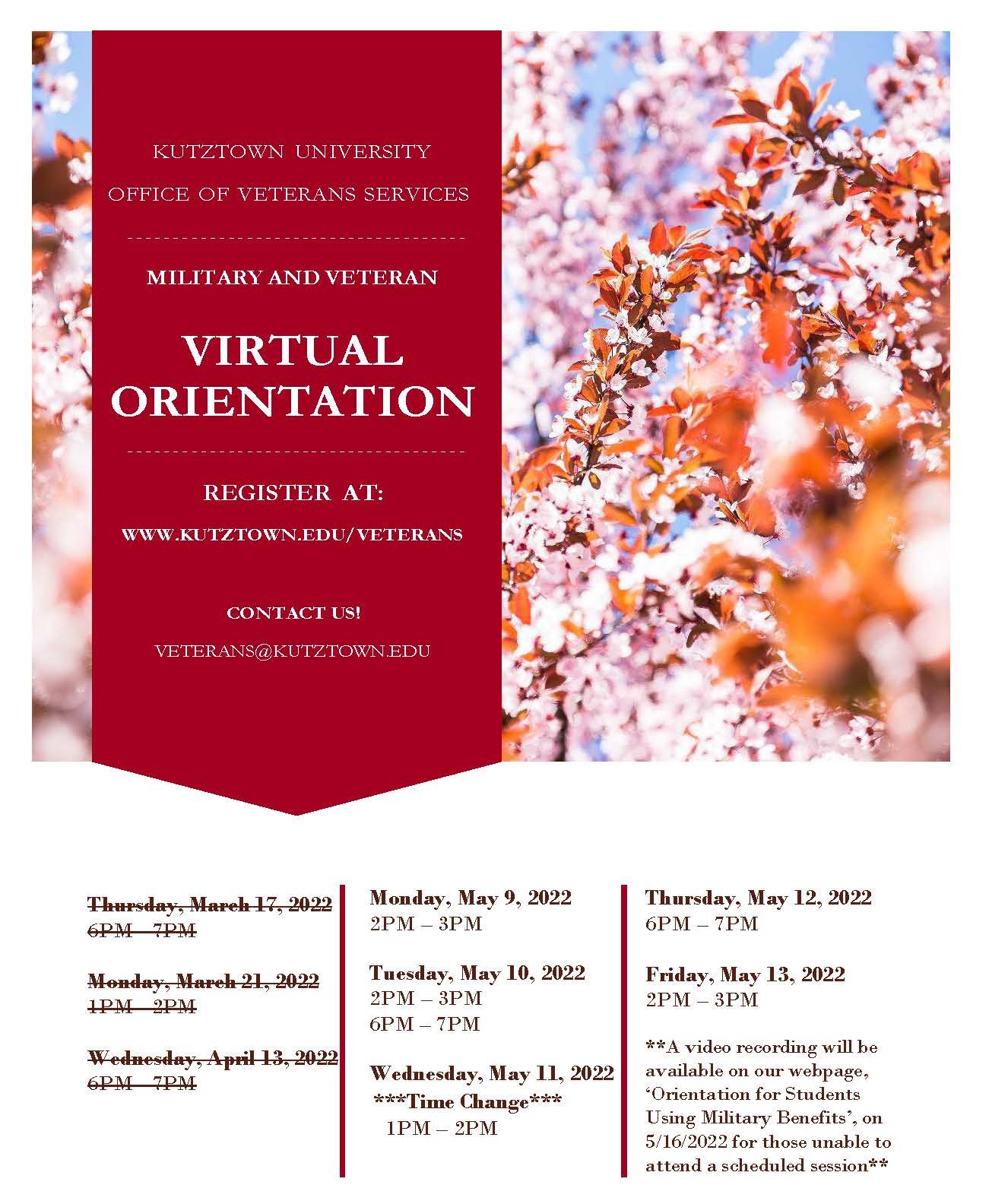 Attending new student Military-Affiliated and Veterans Orientation is a crucial step in transitioning to Kutztown University. This online orientation must be taken in addition to New Student Orientation before the semester begins.
