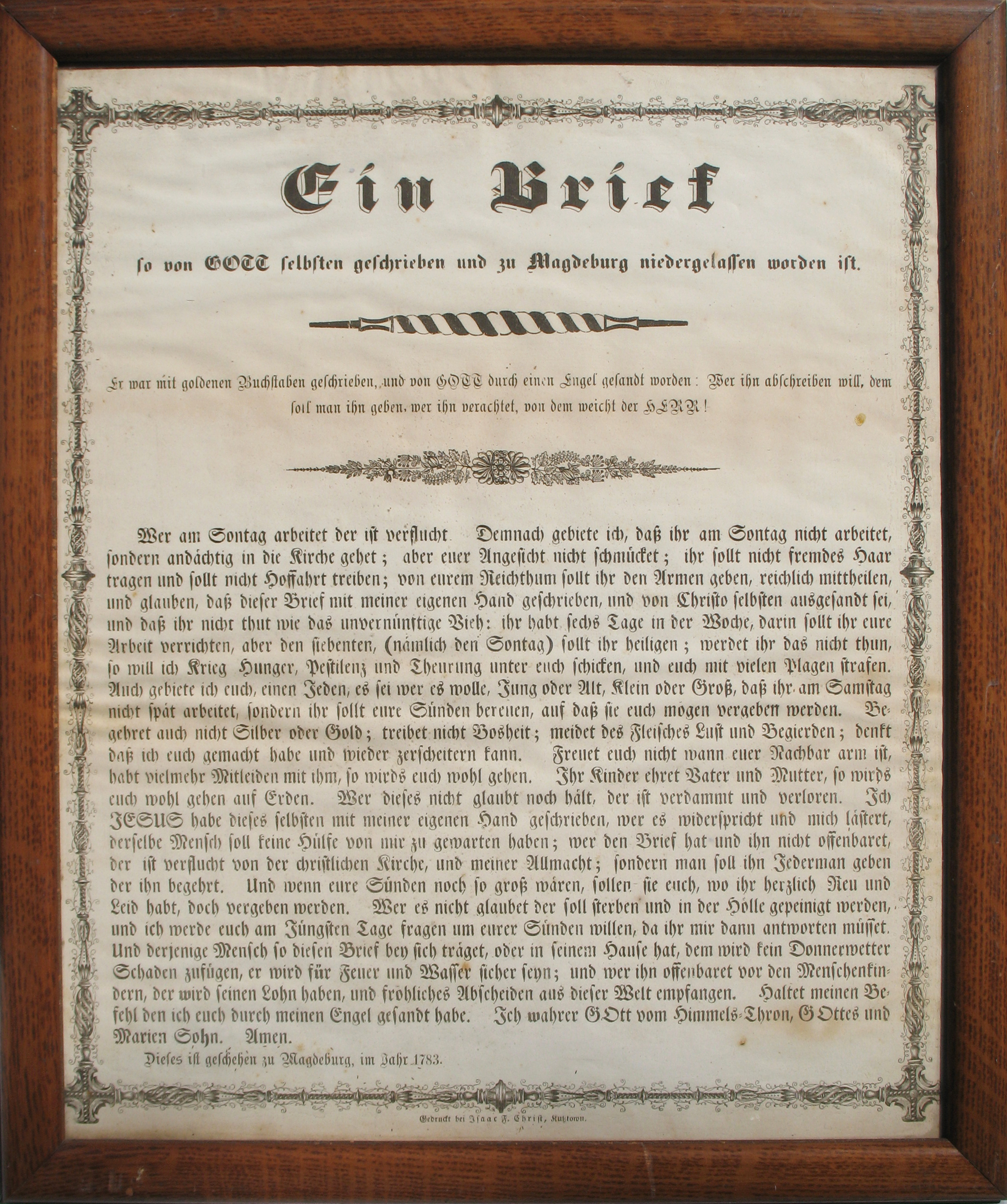 A Pennsylvania Dutch "Letter from Heaven," or Himmelsbrief, printed in 1870 in Kutztown, Pennsylvania by Isaac F. Christ (1840-1904) publisher and printer of the local newspapers "The American Weekly Patriot" in English, and the "Kutztown Journal" in German. This document, was widely circulated in Pennsylvania in various printed and hand-written versions, serving as a house-blessing and a talisman for soldiers, promising extra-biblical revelations to pious people.