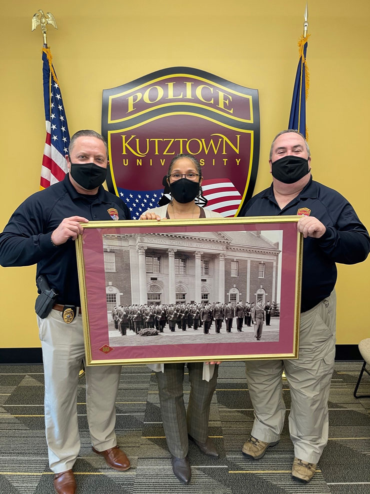 This photo had several owners throughout the years, the Business Office found the photo and asked law enforcement to take ownership because of the paramilitary connection. After the KU Campus Police Headquarters was redesigned, Chief Dillon generously gifted the photo to Veterans Services because he believed it belonged with us and our new military and veteran population. Dillon wanted the students who wonder if they belong at KU to realize that not only do they belong, but they have always been here. The photo proudly hangs on the second floor of the McFarland Student Union between the Army ROTC and Veterans Services offices for all who pass by to see and know that military service is an integral part of Kutztown University’s rich history.