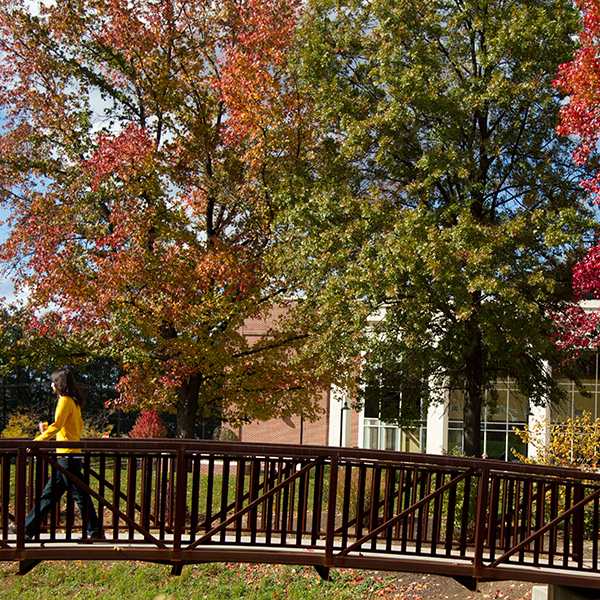 Student walking across the bridge between Grim and Boehm on an Autmn day.