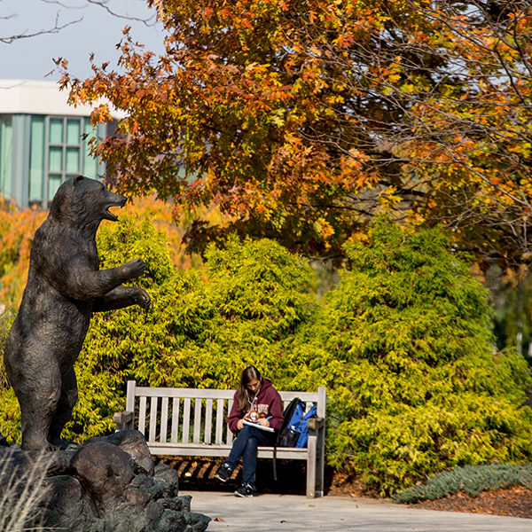 A student studying next to the Bear Statue in front of the Library on a fall day.