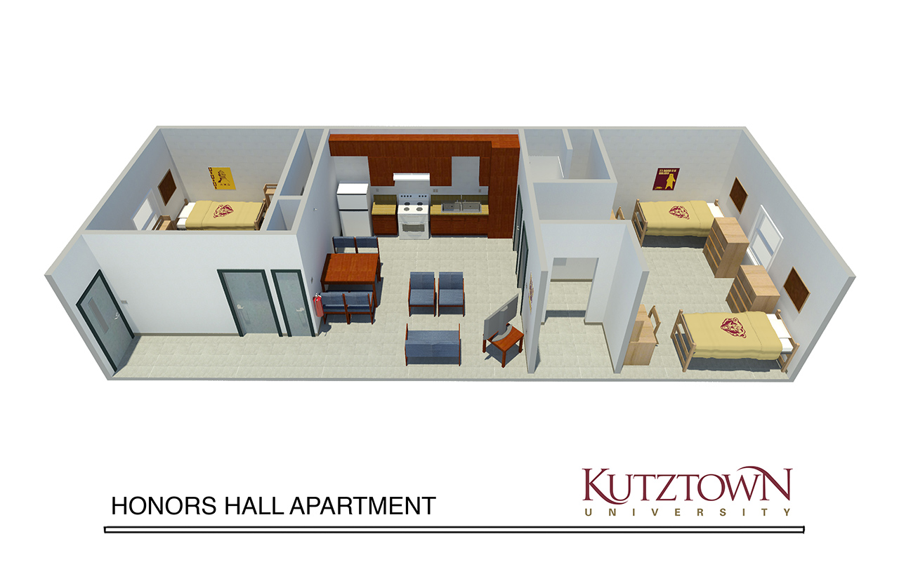 The Honors Building consists of furnished apartments just steps away from campus that includes a kitchen, bathroom, and a common living room area.