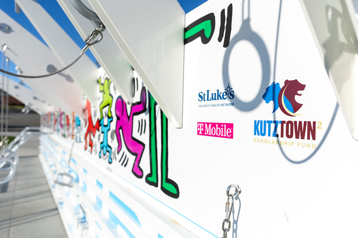 Logos of the sponsors who helped to fund the Fitness court adorn the wall of the court. Sponsors include St. Luke's University Health Network, T-Mobile, Kutztown Scholarship fund.