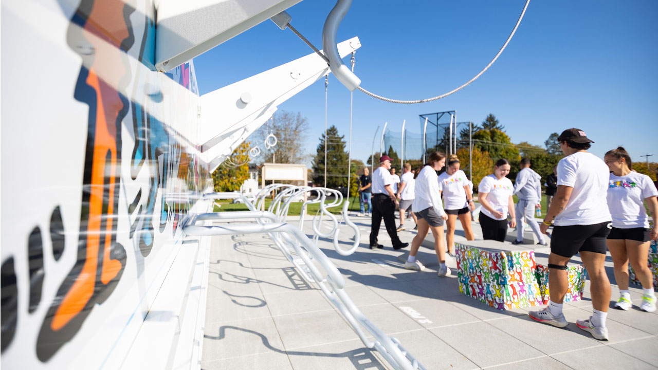 A close-up view of some of the colorful artwork in the Fitness Court.