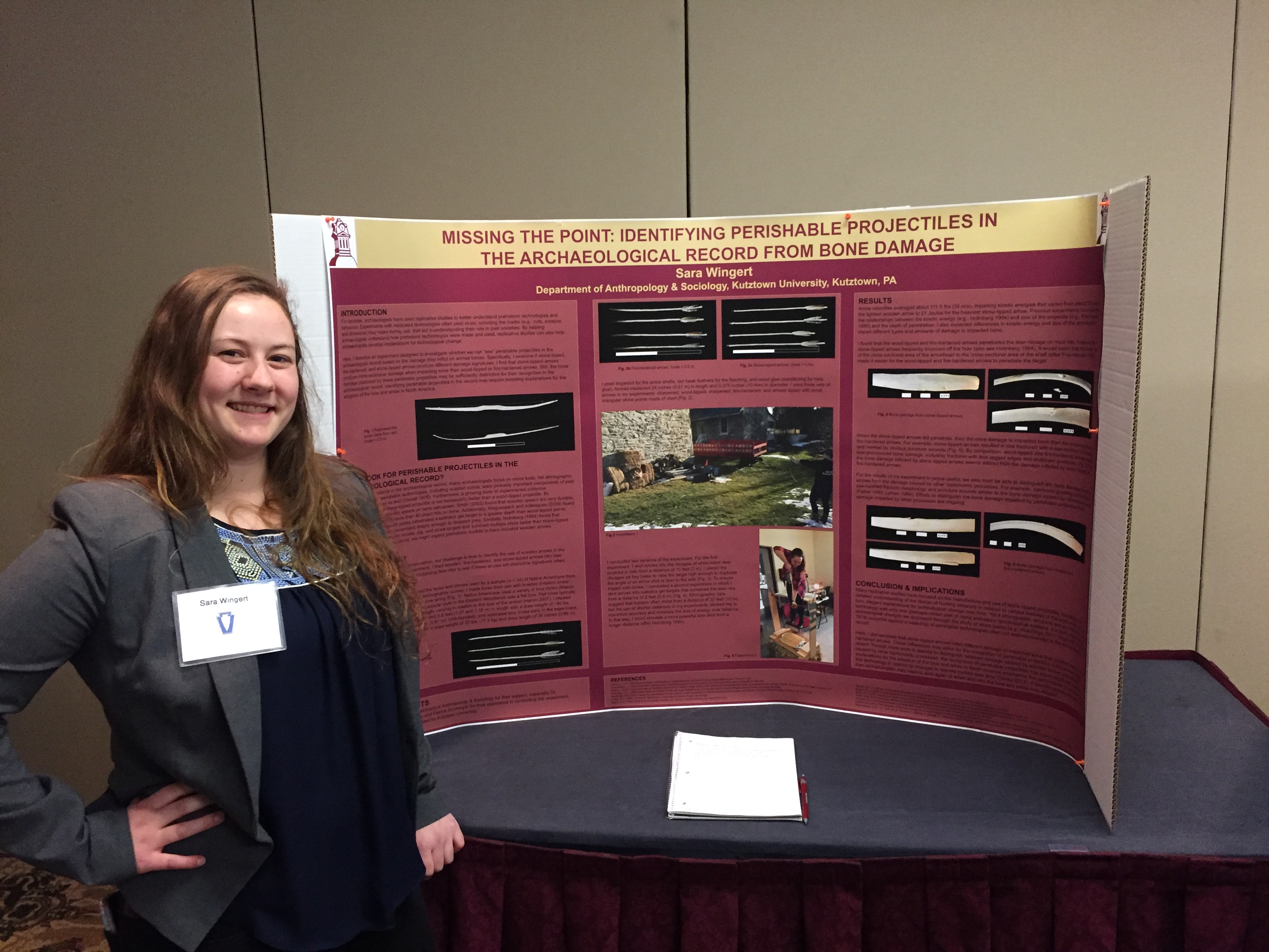 - Anthropology major Sara Wingert presented a poster detailing her replicative study of projectile technology at the Annual Meeting of the Society for American Archaeology in Vancouver, British Columbia. Sara also presented this research at the Annual Meeting of the Society for Pennsylvania Archaeology, winning an award for the best poster.