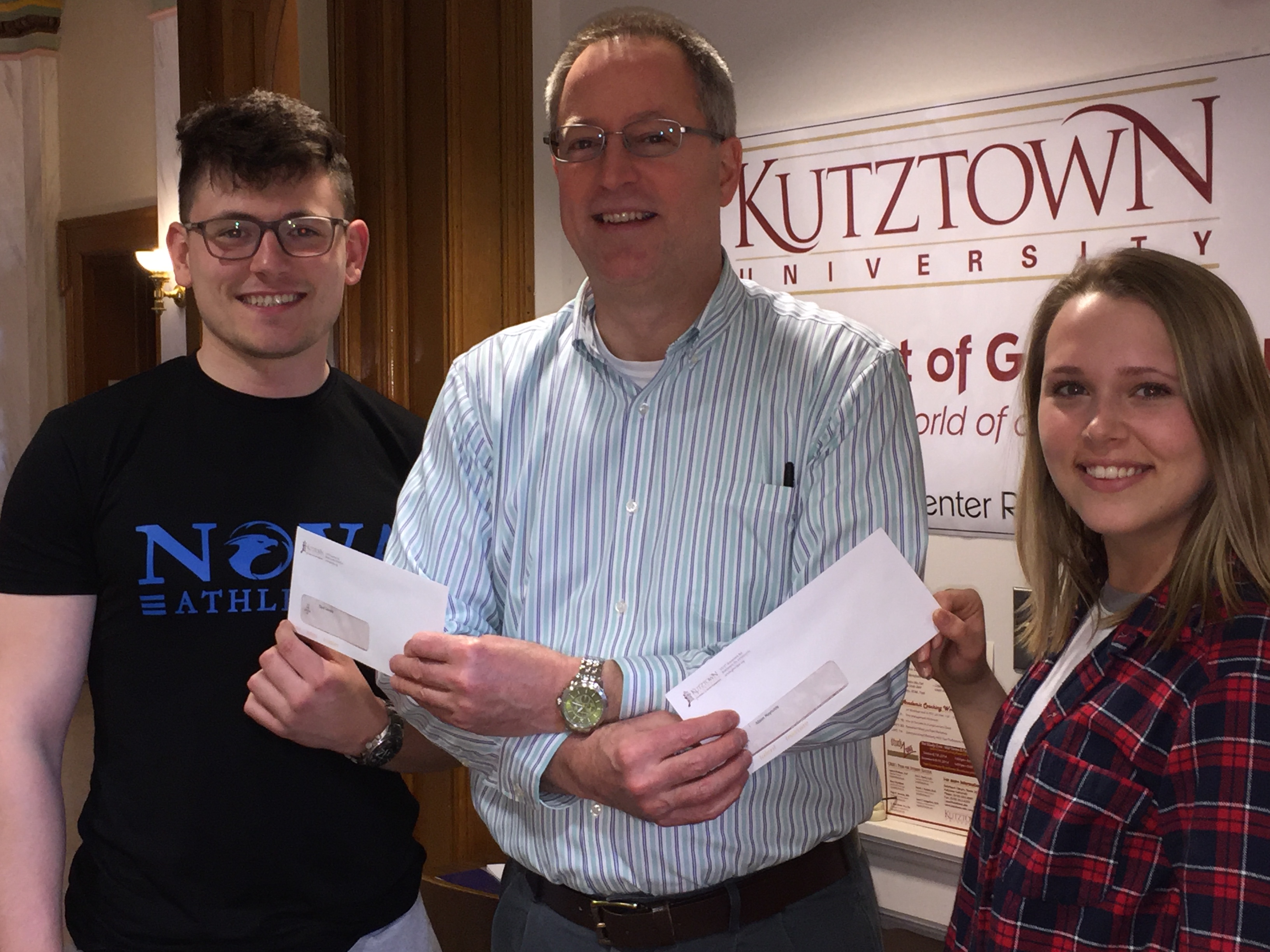 David Connelley and Alison Reynolds receive checks to help defray costs of making professional conference presentations.