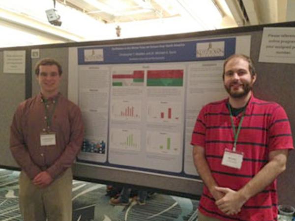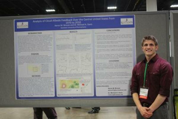 Senior Geography Major Aaron Brouse presenting his poster titled Analysis of Cloud-Albedo Feedback on the Central United States, at the Annual Meeting of the Association of American Geographers, April 2014.