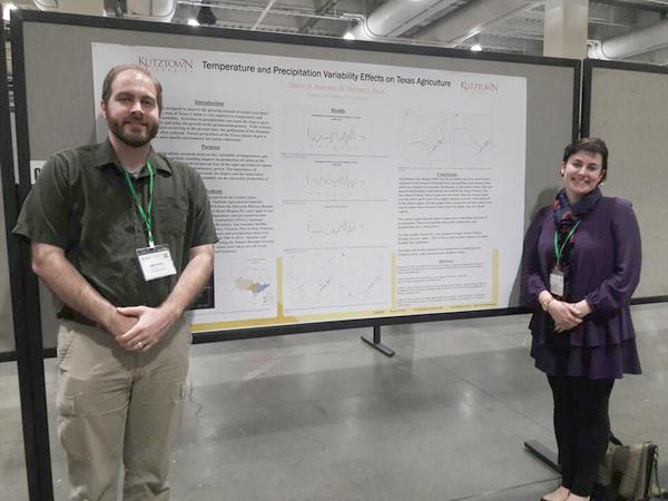Geography Major, and graduate, Shana Rose presenting her poster titled Temperature and Precipitation Variability Effects on Texas Agriculture at the Annual Meeting of the American Association of Geographers, April 2017. Shana's research was conducted under the guidance of Dr. Michael Davis, and Dr. Richard Courtney.