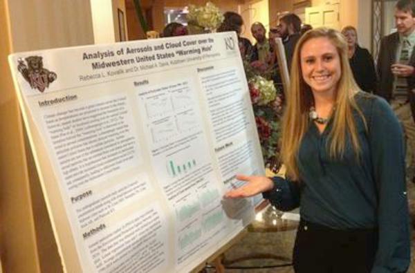 Senior Environmental Science-Biology major Rebecca Kovalik presents her poster titled Analysis of Aerosols and Cloud Cover Over the Midwestern United States 'Warming Hole' at the 2014 Annual Fall Dinner Meeting of the Delaware Valley Geographical Association in West Chester, PA. Her poster represents preliminary results of research she is performing with Dr. Michael Davis of the Department of Geography.