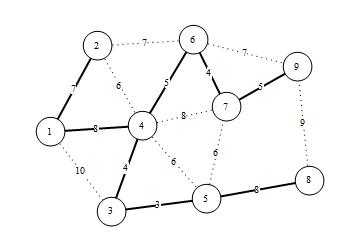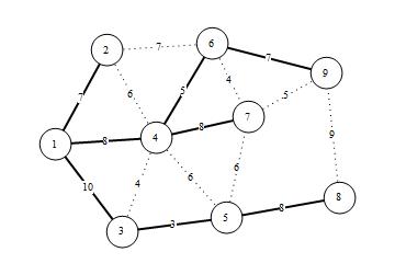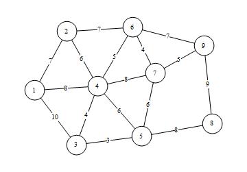 The images below describe an example of the CTP. Consider a campus of nine buildings, represented by nodes 1 - 9 below such that Node 1 represents the central server. The edges between nodes represent allowable routes for digging trenches and the numbers on the edges represent the distance between buildings (in hundreds of feet, for example). See FIGURE 1.