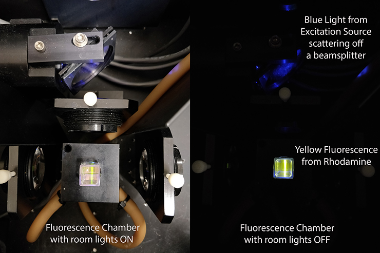 In the image to the right, you are looking down into the chamber of a fluorescence spectrometer. In one image the room lights are on so you can some of the optics. A sample of rhodamine is being bombarded with blue light from a lamp. Rhodamine absorbs some of that blue light, then emits yellow light. That yellow fluorescence is much easier to see with the room lights off.