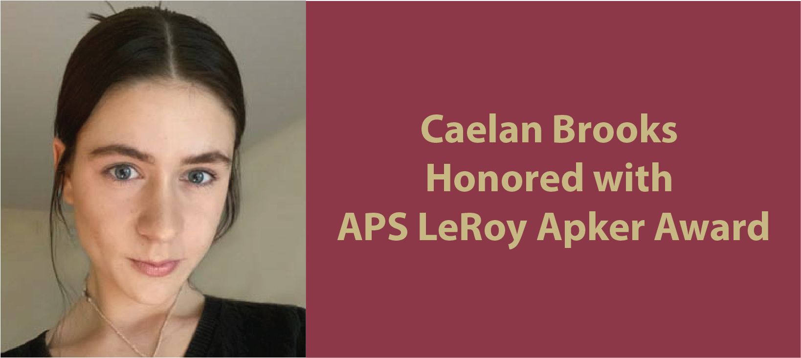 October 2021 ... Kutztown University Physics Graduate, Caelan Brooks ’21, is the recipient of the LeRoy Apker Award of the American Physical Society (APS), which recognizes outstanding achievements in physics by undergraduate students. This is the highest honor awarded to undergraduate physicists in the United States with only two awards presented each year (one to a student from a Ph.D. granting institution, and one to a student from a non-Ph.D. granting institution). Her award cites: “the discovery of distinct dynamical regimes for coherent ultracold atoms confined in a ring-shaped lattice potential; and for developing a statistical model that depicts the formation of phenotypic patterns associated with bacterial biofilm growth."
