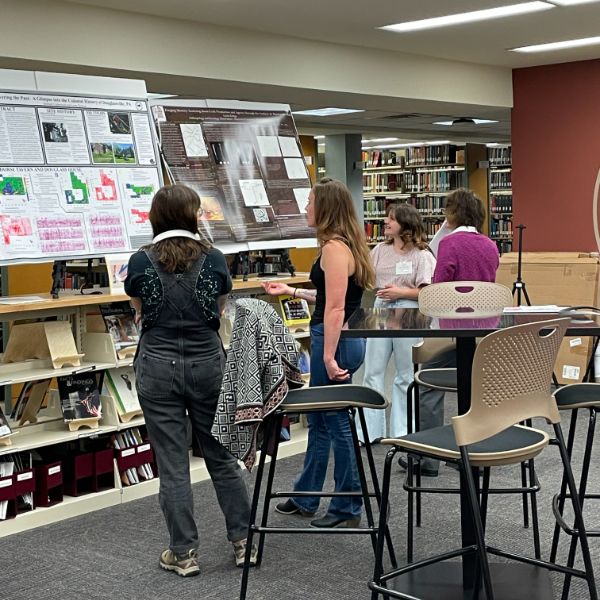 Students taking in the posters and artwork presented at the KU Inspires event in April 2024.