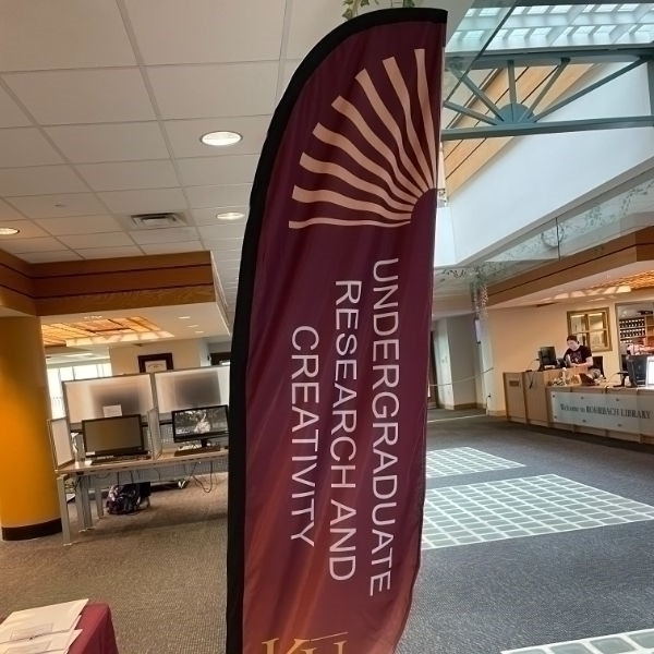 maroon flag displayed indoors reading "undergraduate research and creativity"