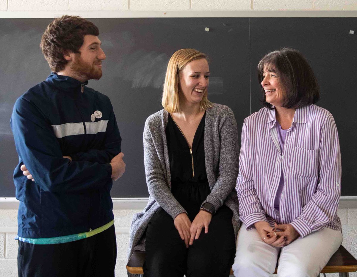 Female staff member and female student sitting on a desk while a male student stands to the side, all of them smiling at each other