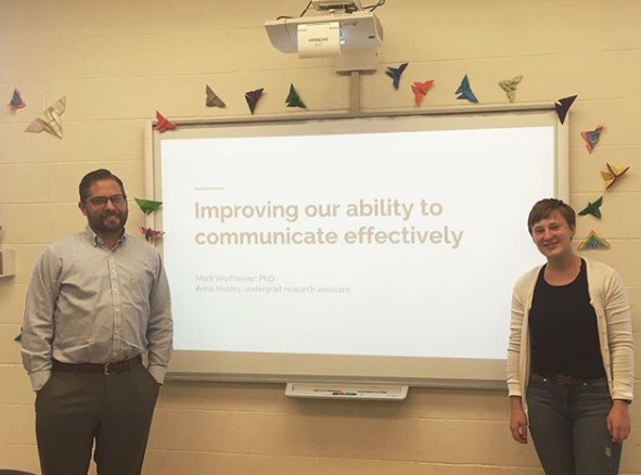 Dr. Wolfmeyer and KU student Anna Nissley, standing on either side of a powerpoint slide that reads "improving our ability to communicate affectively"