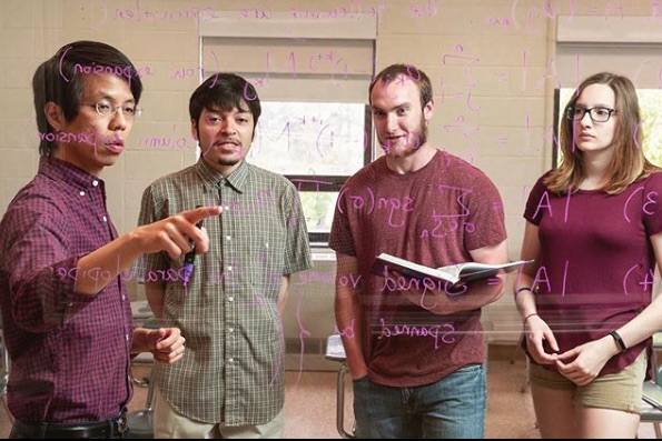 Dr. Tony Wong lecturing to three students on mathematics, with mathematic symbols written on glass board in the foreground
