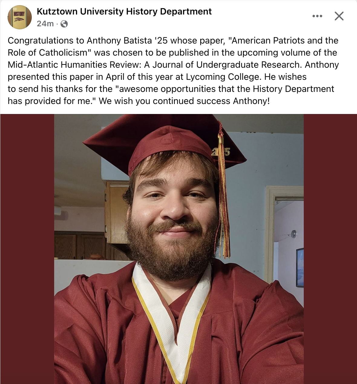 Congratulations to Anthony Batista '25 whose paper, "American Patriots and the Role of Catholicism" was chosen to be published in the upcoming volume of the Mid-Atlantic Humanities Review: A Journal of Undergraduate Research. Anthony presented his paper in April at Lycoming College.
