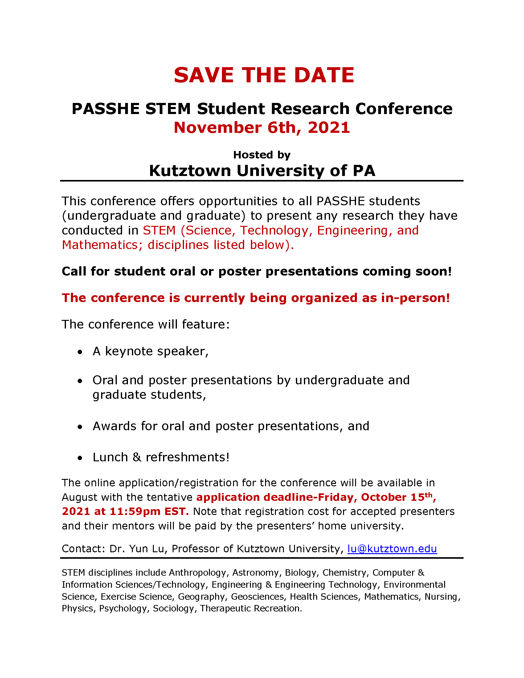 We would like to inform you that Kutztown University is proud to host the 2023 PASSHE-STEM Student Research Conference on Saturday, November 11th, 2023. The conference is currently being organized as in-person.