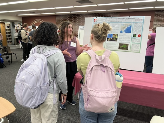 More than 50 student researchers presented their original work at this year's KU Inspires, A Celebration of Undergraduate Research and Creativity. KU Inspires is an on-campus, low stakes conference held in Rohrbach Library, where undergraduate and graduate students can share their ideas in a friendly environment. The conference featured panel presentations on the hour and an all-day poster gallery. Formats include: paper presentations, posters, artwork, original creative writing, comics/zines, performances and short films. Watch for announcements in the fall semester about KU Inspires 2026. Photo: Allison Lentz (Faculty Mentor: Greg Setliff) talks about her research with conference attendees.