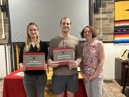 Lily Brunell (BS Music Education, German minor) and Gabriel Sullivan (BS Computer Science/BA German) were recently inducted into the Sigma Omicron Chapter of Delta Phi Alpha, the National Collegiate German Honor Society. Photo includes: Brunell, Sullivan and chapter advisor, Lynn M. Kutch.
