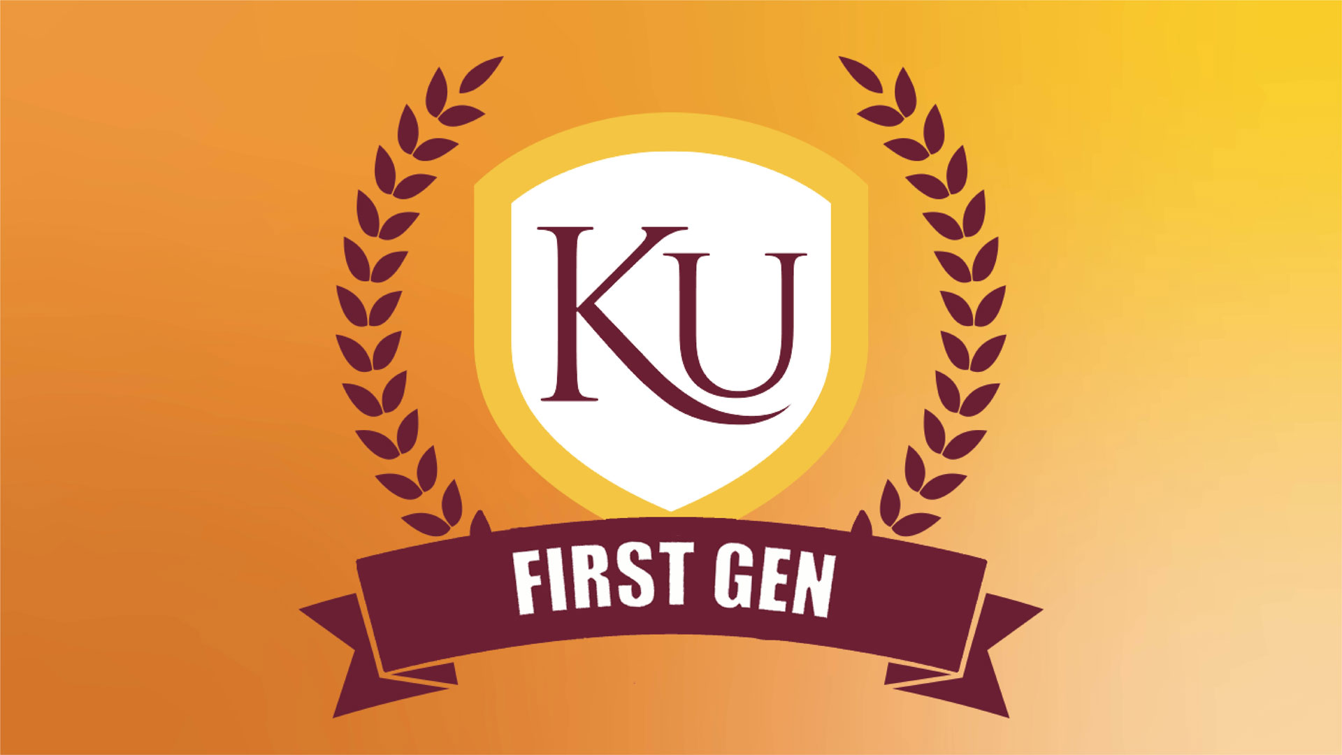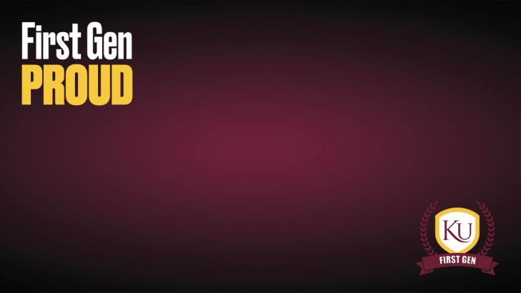 A maroon wallpaper with a heavy black vignette reading "First Gen Proud" on the top left in white and spirit colors with KU's First Gen seal in the bottom right.