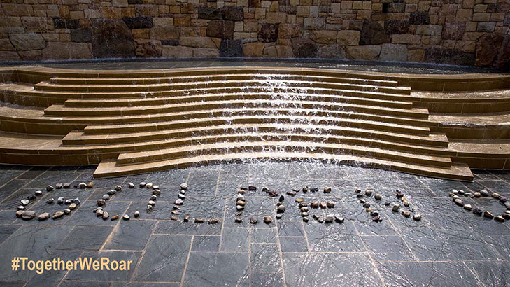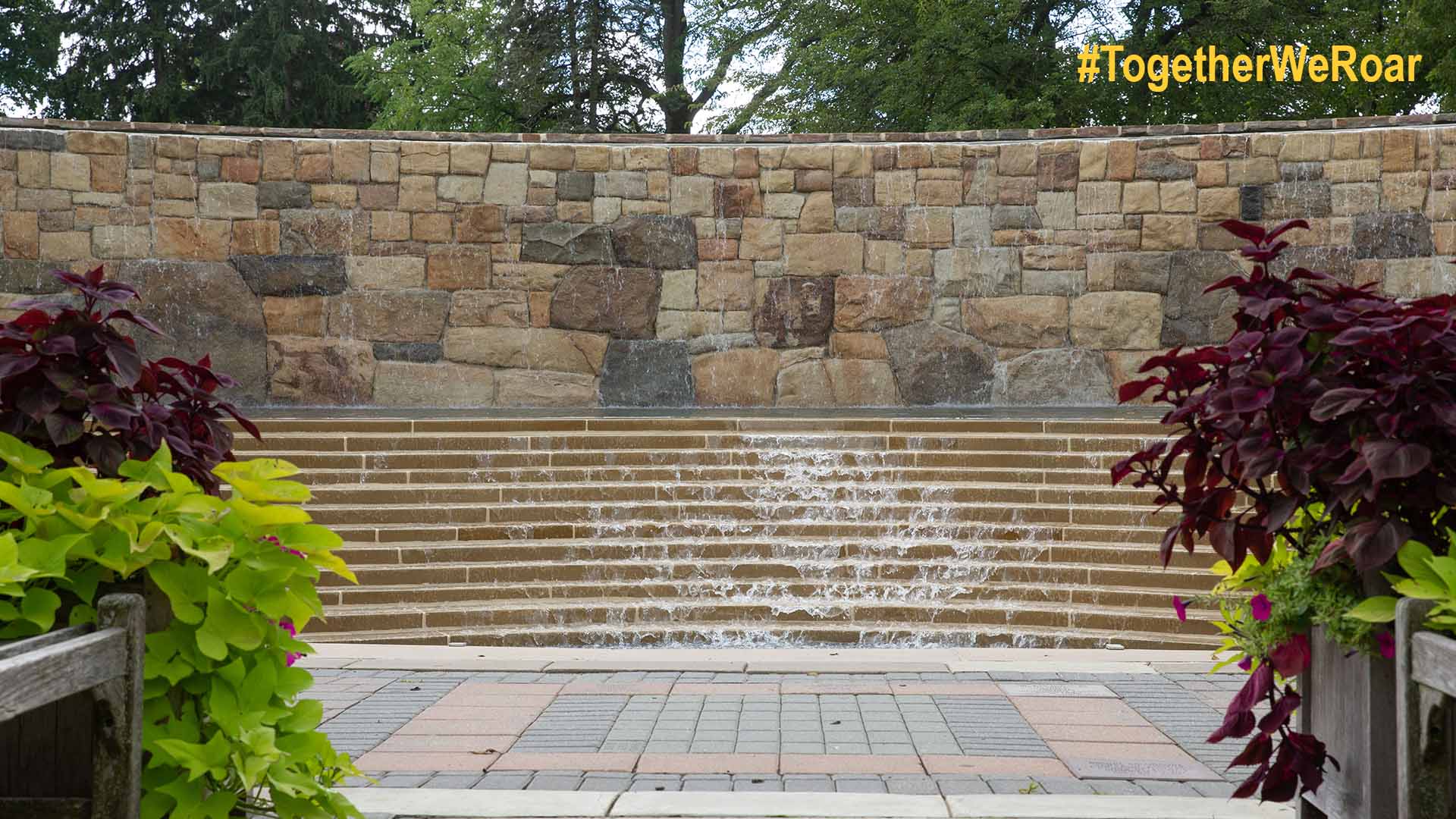 Photo of the large fountain on the Alumni Plaza with the word golden and a heart formed with rocks in the water.
