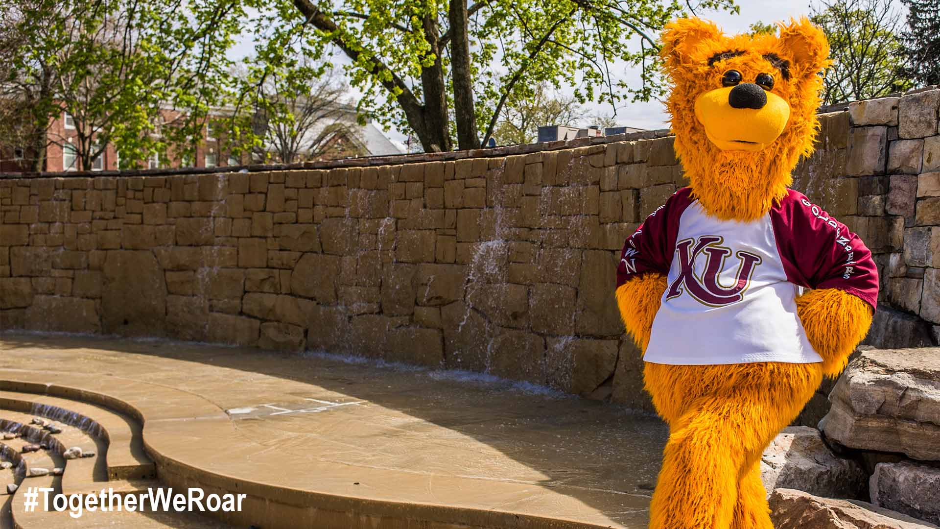 Avalanche the Golden Bear power posing in front of the Alumni Plaza fountain wall on a sunny day.