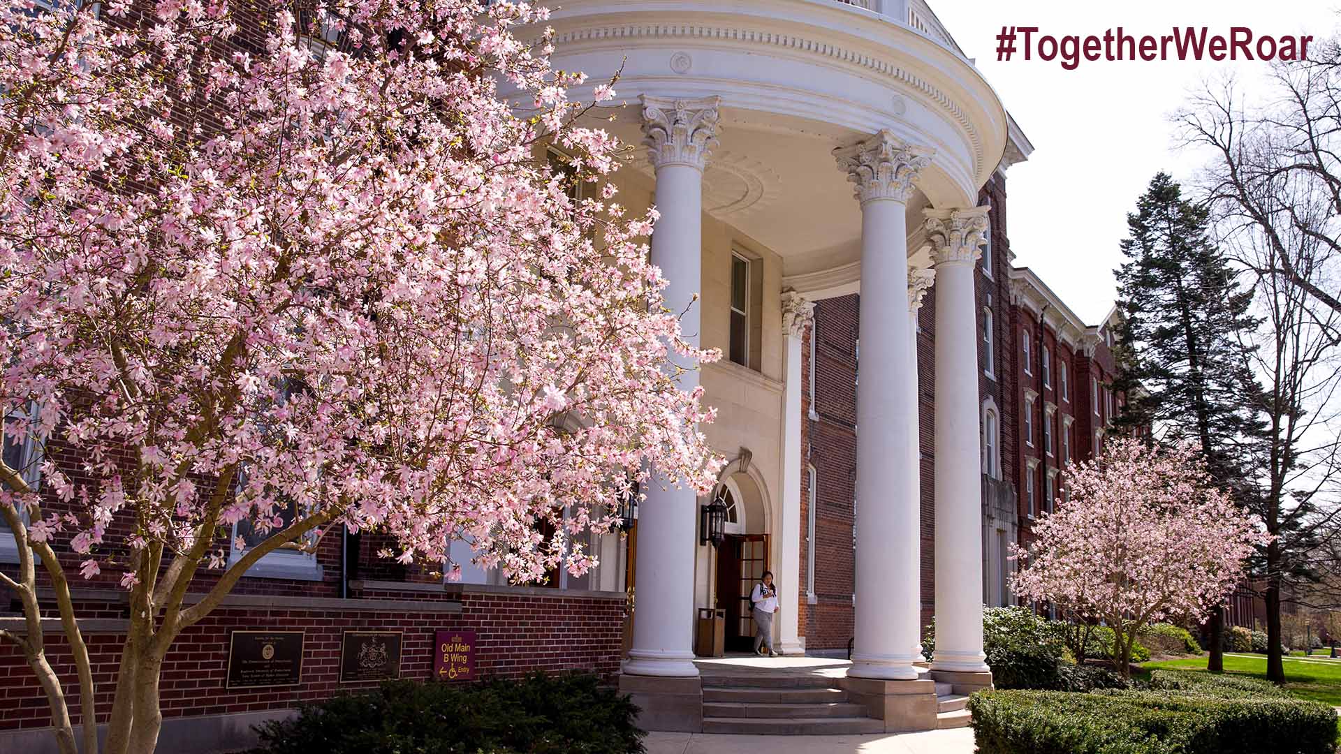 Old Main's iconic white columns framed by flowering spring trees covered in pink blossoms.