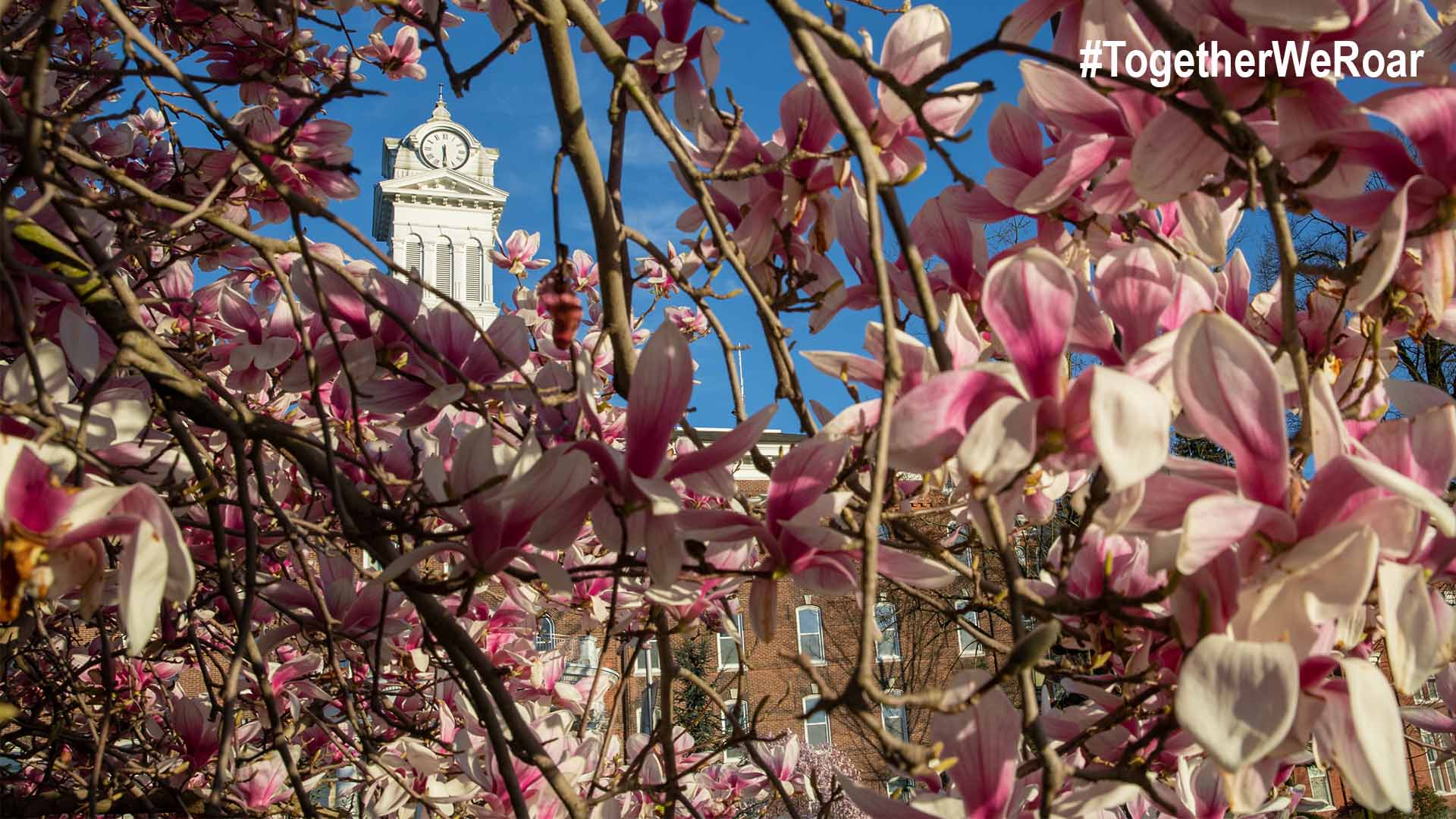 Old Main's clock tower surrounded by branches of pink magnolia blooms