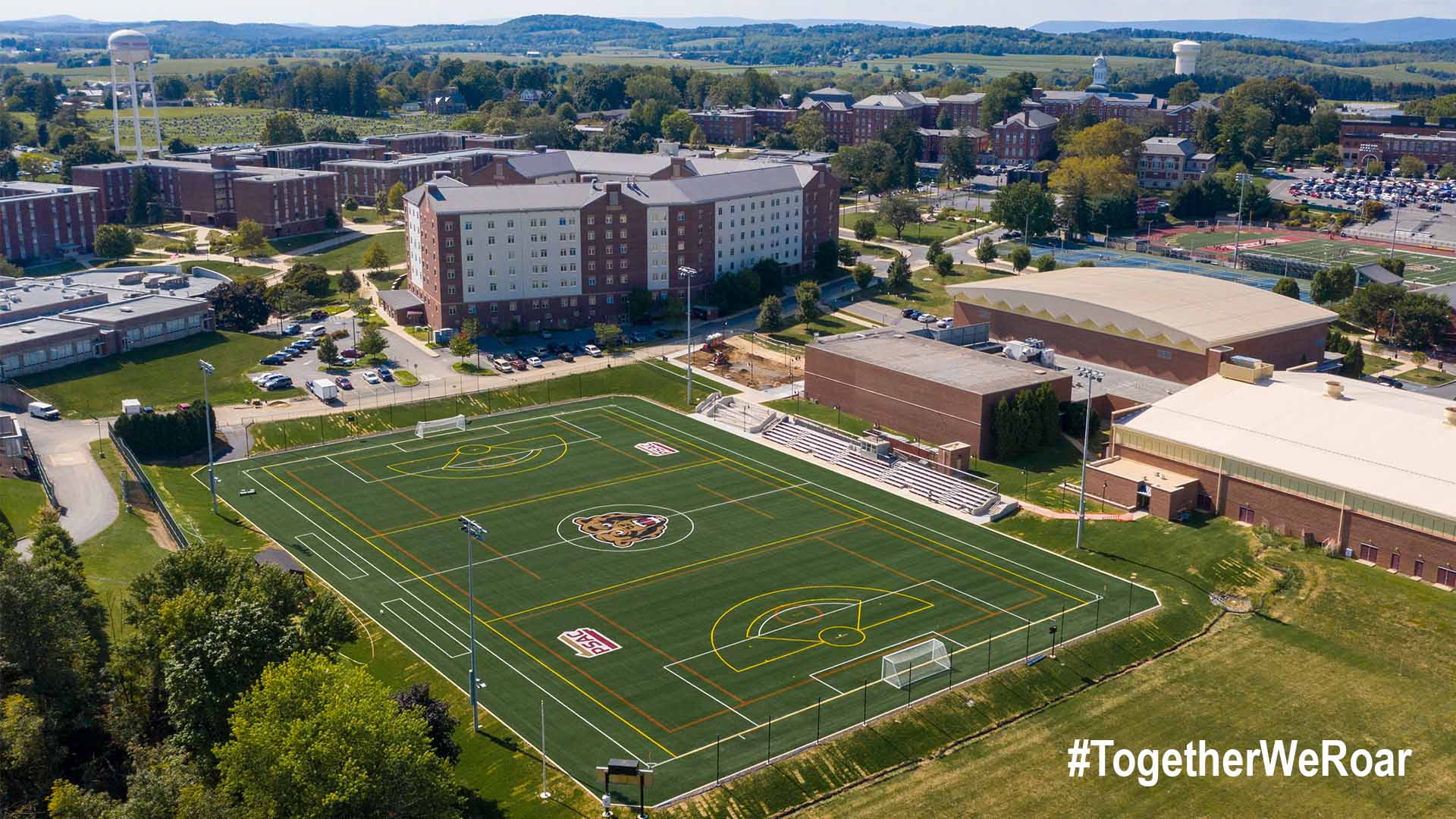 An aerial view of the south side of campus, featuring Keystone Field, Keystone Hall, Dixon Hall to the back of Old Main.