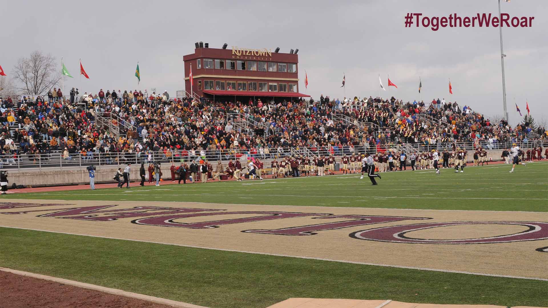 The end zone of University Field at Andre Reed Stadium during a football game with the stands full of cheering fans in the background.