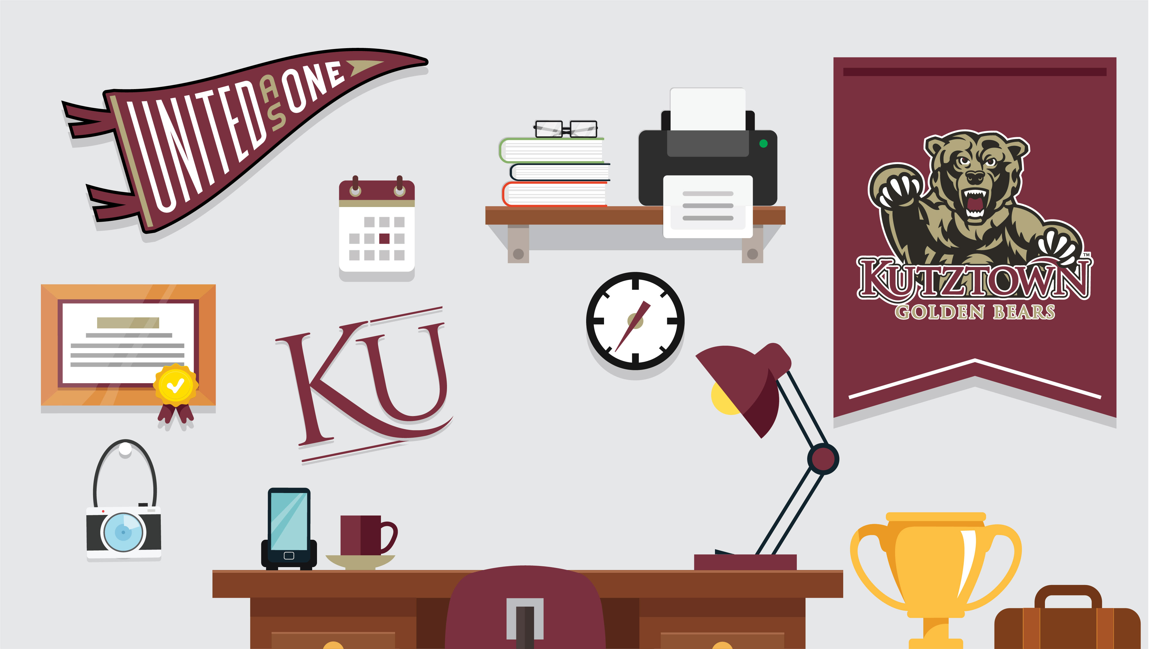 An illustration of a typical office setup with desk, lamp, shelf and various wall decorations of KU.