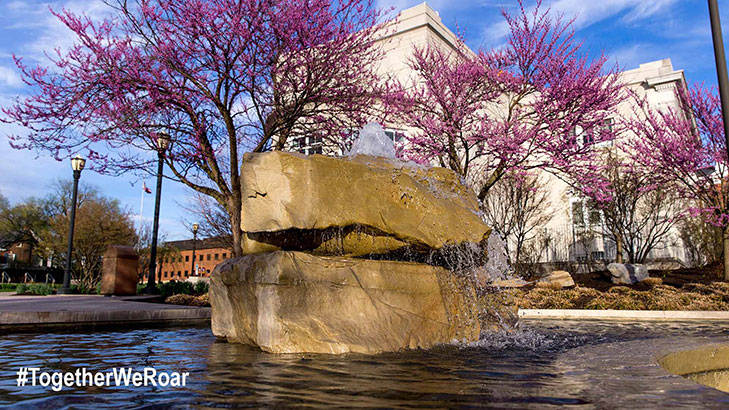 Water bubbles over the large rocks into a pool of tranquil water on the Alumni Plaza surrounded by trees blooming pink blossoms in the spring.