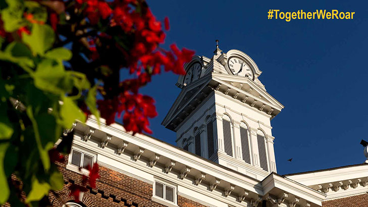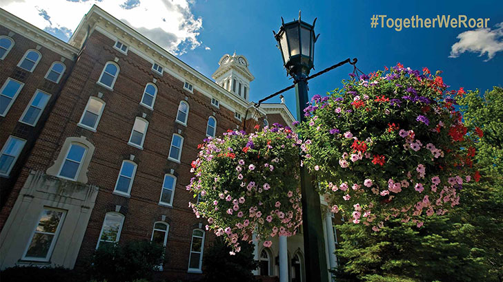 The Old Main clock tower with blue skies in the background and a floral basket with red blooms and green vines in the left corner.