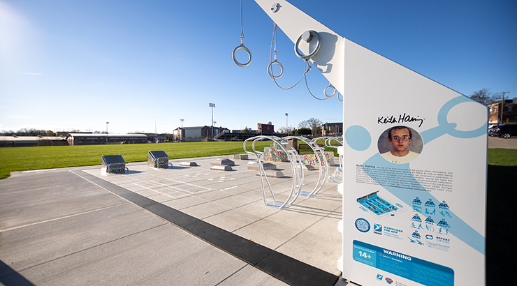 The Keith Haring Fitness Court is an incredible opportunity for the Kutztown community to pay reverence to one of its native sons, as Haring was born and raised in Kutztown, Pa. Despite his worldwide fame, Haring always stayed true to his roots and would often refer to himself as "Keith from Kutztown." Haring went to Kutztown High School and his legacy lives on throughout the borough of Kutztown. To recognize and honor the love he had for his hometown, Haring gifted the ‘Untitled (Figure Balancing on Dog)’ to Kutztown Park in the early 90s, where the sculpture remains today. More of his iconic art can be found on a floor mural in the New Arts Program building nestled right on Main Street, where it is preserved under coats of polyurethane.